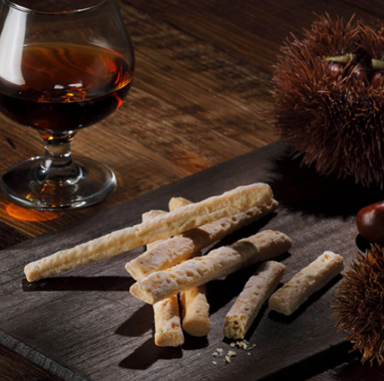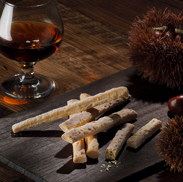 加入栗子糖漬風味巧克力,表面撒上蘭姆酒粉,呈現成熟穩重的栗子風味。