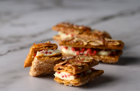 使用濃郁奶油製作的法式千層酥餅,搭配焦糖香氣濃厚的烘烤杏仁點綴,口感酥脆、層次分明。