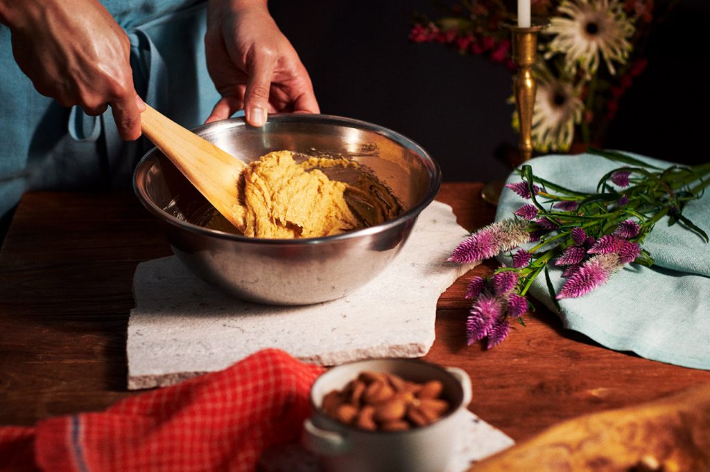 在濕潤的質地麵團上混合杏仁和巧克力片,帶出堅果的濃郁香氣。