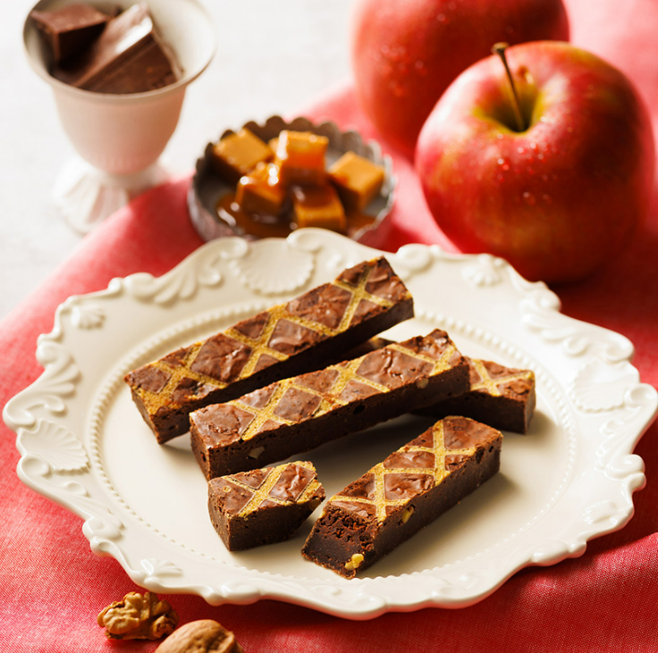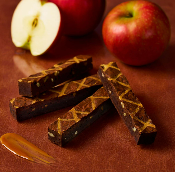 以兩種精選頂級可可脂巧克力製成的布朗尼生地,加入核桃與以「卡爾瓦多斯(蘋果白蘭地)」浸漬的乾燥蘋果,帶來深邃的風味。外層以焦糖風味生地裝飾,增添可愛氛圍。優雅的蘋果香氣與微苦焦糖交織出絕妙平衡。
