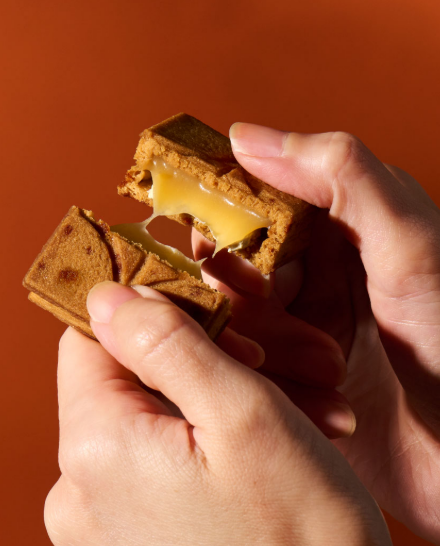 將香酥餅乾中夾入 濃厚奶油餡+滑順焦糖餡 的雙層內餡。