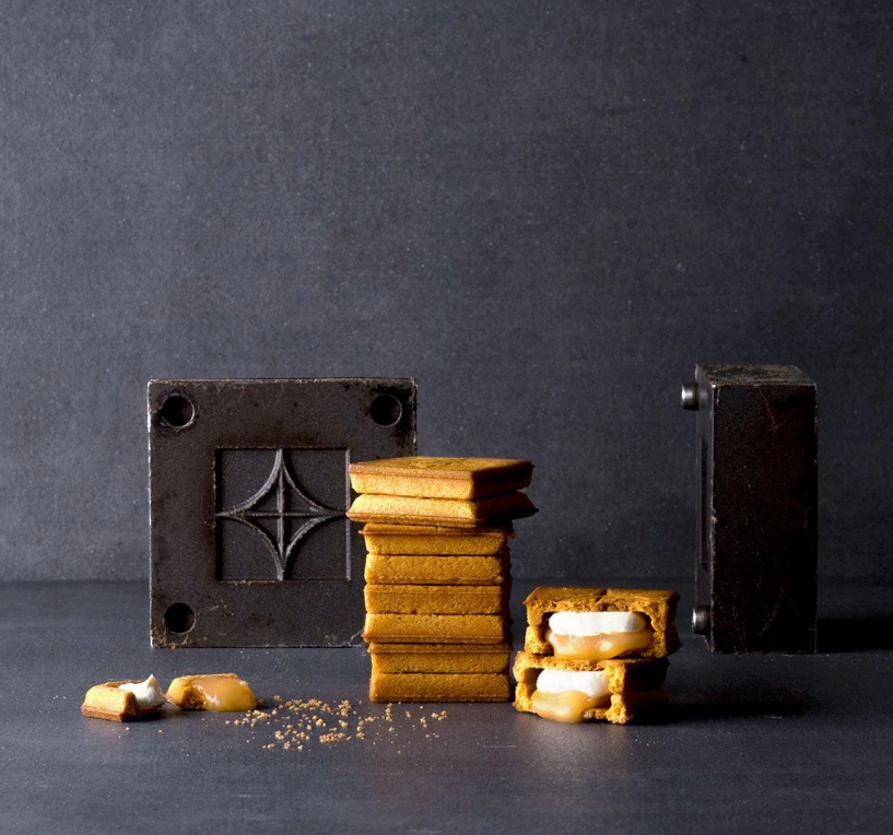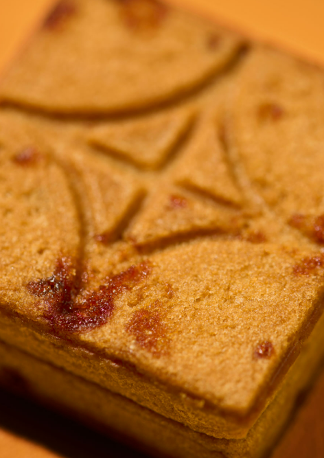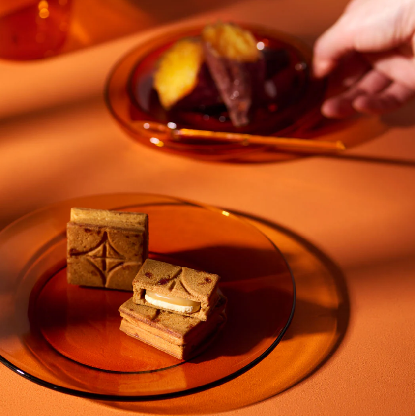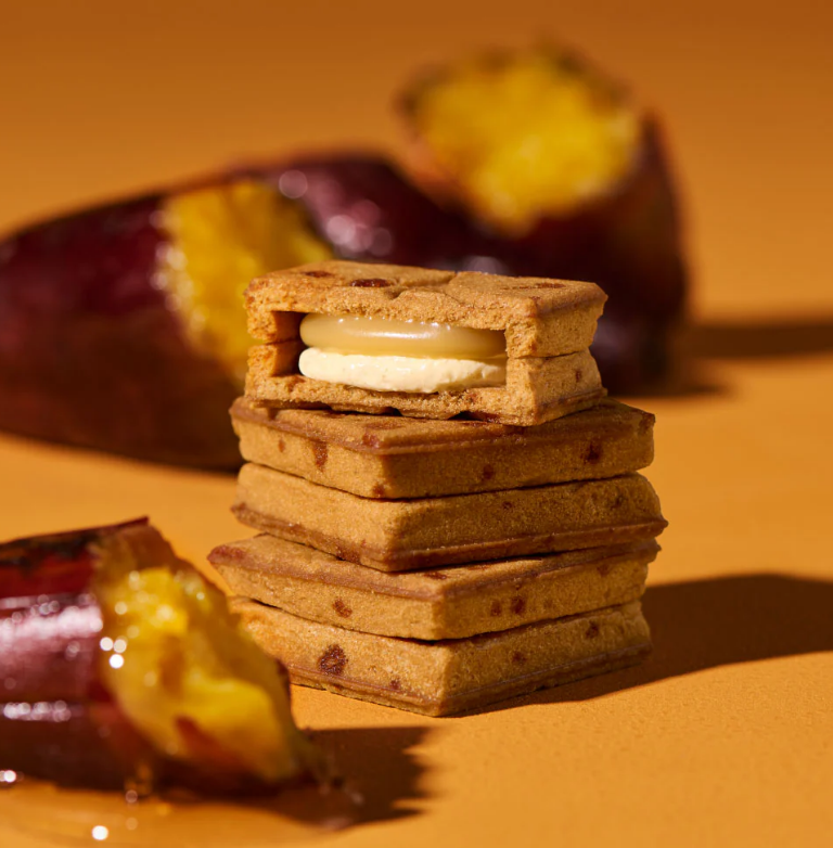 餅乾部分採用日本傳統和菓子製法「はさみ焼き(夾燒工法)」,高溫壓烤讓餅乾外皮格紋分明,口感特別酥脆。