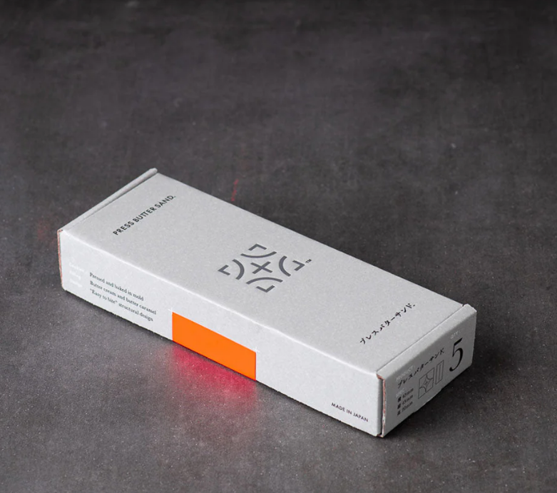 禮盒外包裝上壓印了 PRESS BUTTER SAND 的燙金標誌,並可依需求免費提供手提袋或祝賀用的「熨斗紙(のし)」,不論是贈送親友或正式場合的伴手禮,都相當合適。
